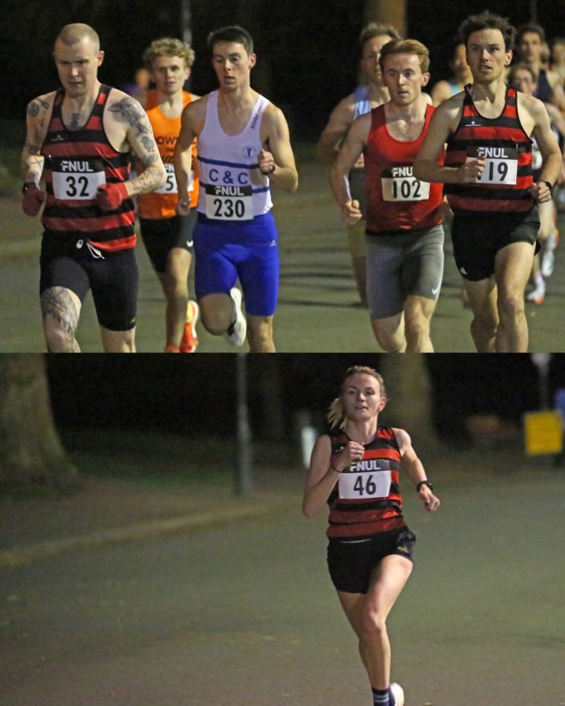 The latest Friday Under the Lights 5K at Battersea was a veritable PB bonanza for Club members, with Men’s captain Danny Shaw leading the way with his 14:36 PB clocking. There were PBs also for Ollie Mills 14:48, Fabien Whitelock 15:05, Thomas Patterson 15:15, Charlie Wood 15:17, Ryan Hickey 15:17, Ioan Jenkins 15:26 and, smashing 18 for the first time, Soraya Lockwood 17:59. It was great to see Lewis Laylee racing well again with a 14:54 clocking, and there were strong runs from Harry Roberts 15:36, M40 Jack Brotchie 15:39, M45 Raj Paranandi 16:05, Margaret Coogan 17:17 and Cali Brennan 18:24.